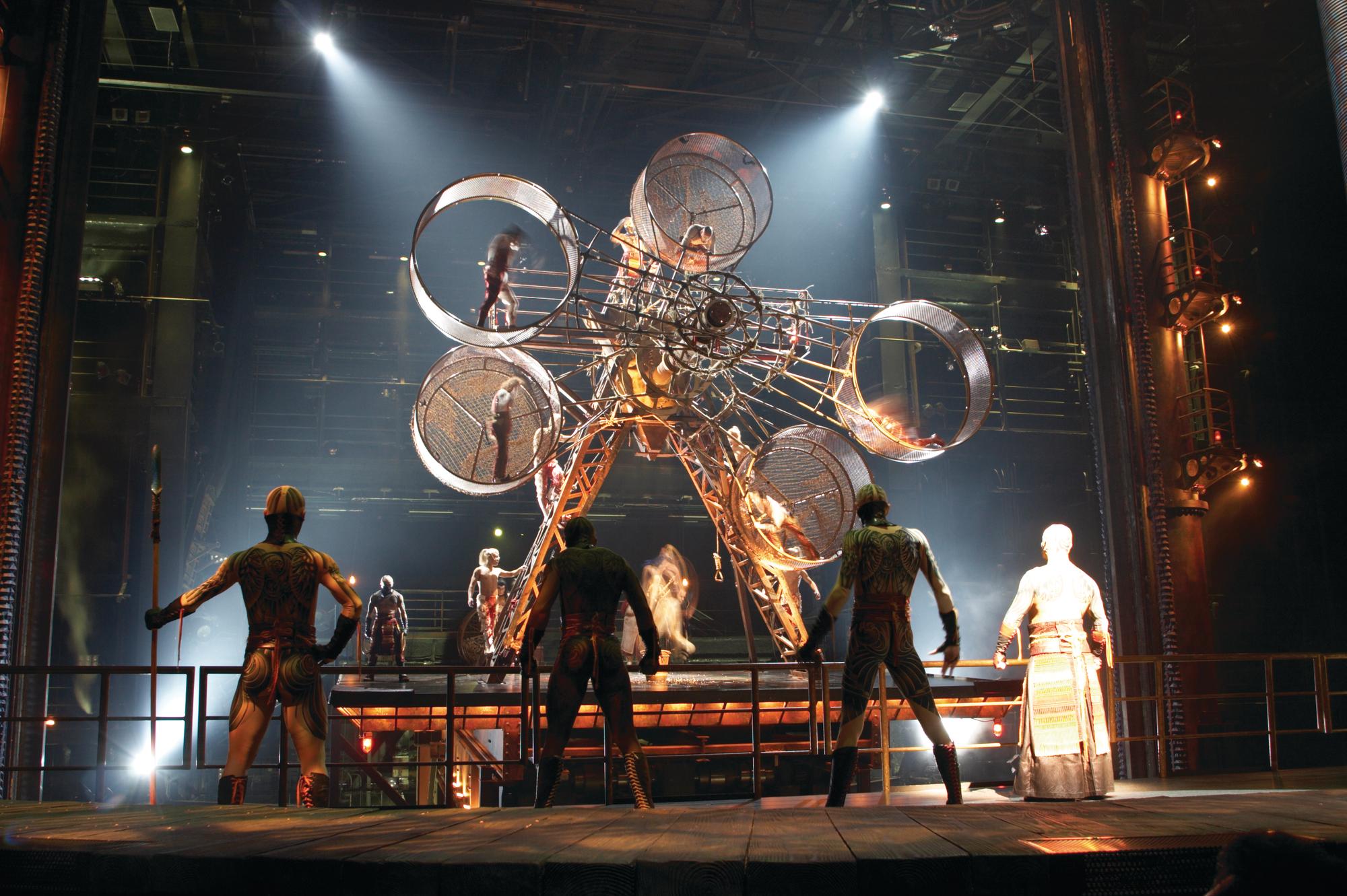 KÀ at MGM Grand follows twin siblings on a quest that unfolds across battles, aerial duels, and gravity-defying feats. Its signature stage tilts, rotates, and stands upright to turn every scene into a moving work of art.