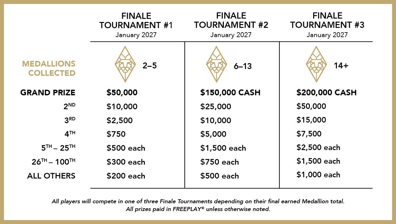 Just play in all of your favorite MGM Rewards Slot Tournaments across all MGM Rewards Destinations and begin earning Medallions. The more Medallions you earn, the higher the prize pool you'll reach!