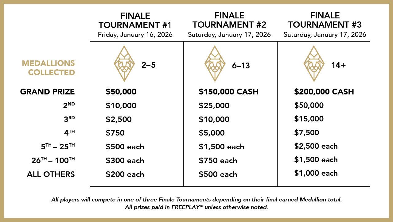 Participate in at least two of the MGM Rewards Slot Series qualifying tournaments throughout the year and you'll be invited to compete in the complimentary MGM Rewards Slots Series Finale tournament on January 16 & 17, 2026. Play in even more qualifying tournaments to grow your finale prize pool, up to $200,000 CASH!